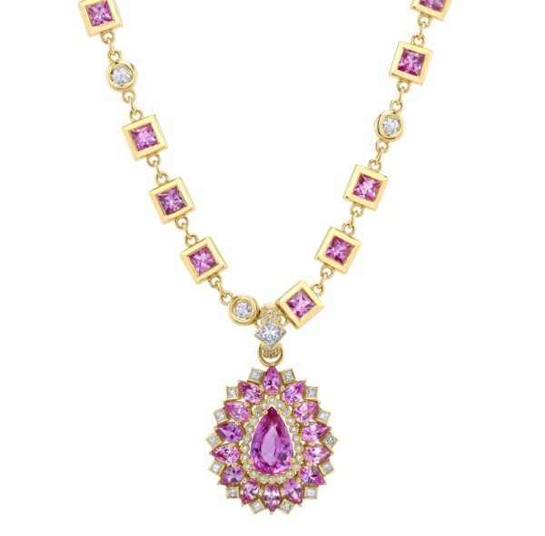 Erica Courtney presents 18K Yellow Gold “Pear” Pendant, featuring a 4.57ct Pink Sapphire pear cut center, accented with 4.57ct Pink Sapphires and 1.07ctw Diamonds. Accompanied by 18K Yellow Gold 9.44ctw Pink Sapphire and 1.09ctw Diamond bezel chain in 18”.