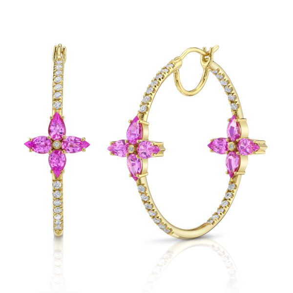 Erica Courtney presents 18K Yellow Gold “Quad Hoop” earrings, featuring 4.53ctw Pink Sapphire, accented with 1.12ctw Diamonds.
