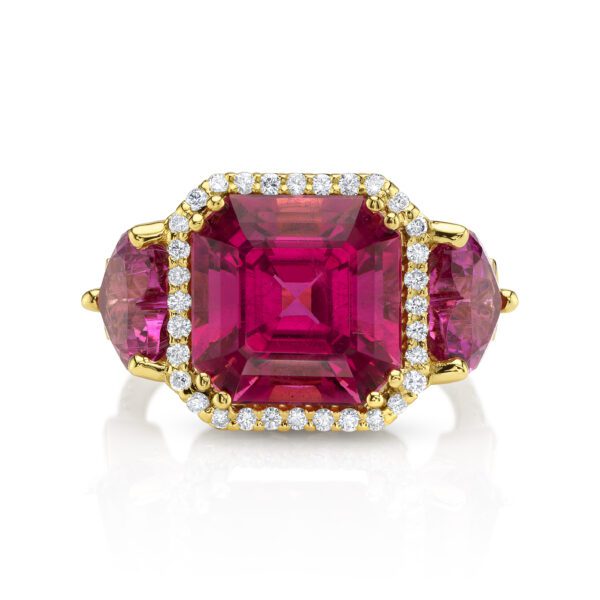 Erica Courtney presents 18K Yellow Gold “Three Stone” ring, featuring a 7.76ct Rubellite, 3.78ctw Heart Shape Rubellites, accented with 1.70ctw Diamonds.